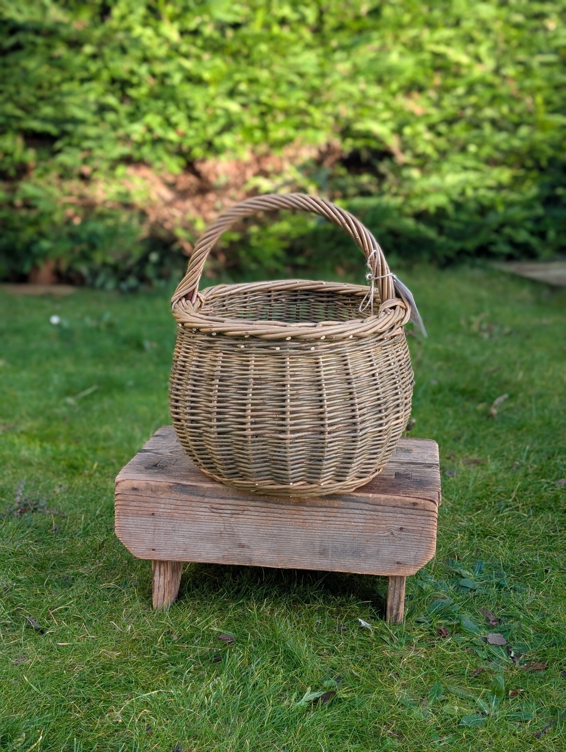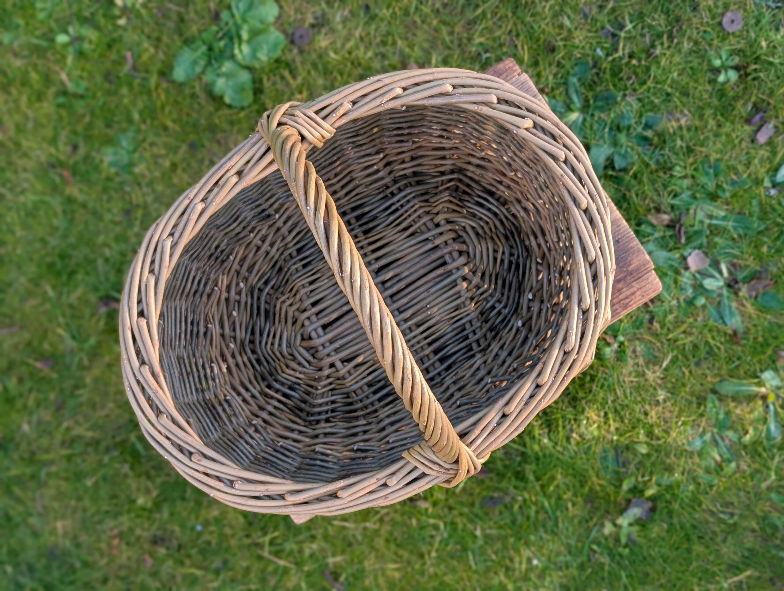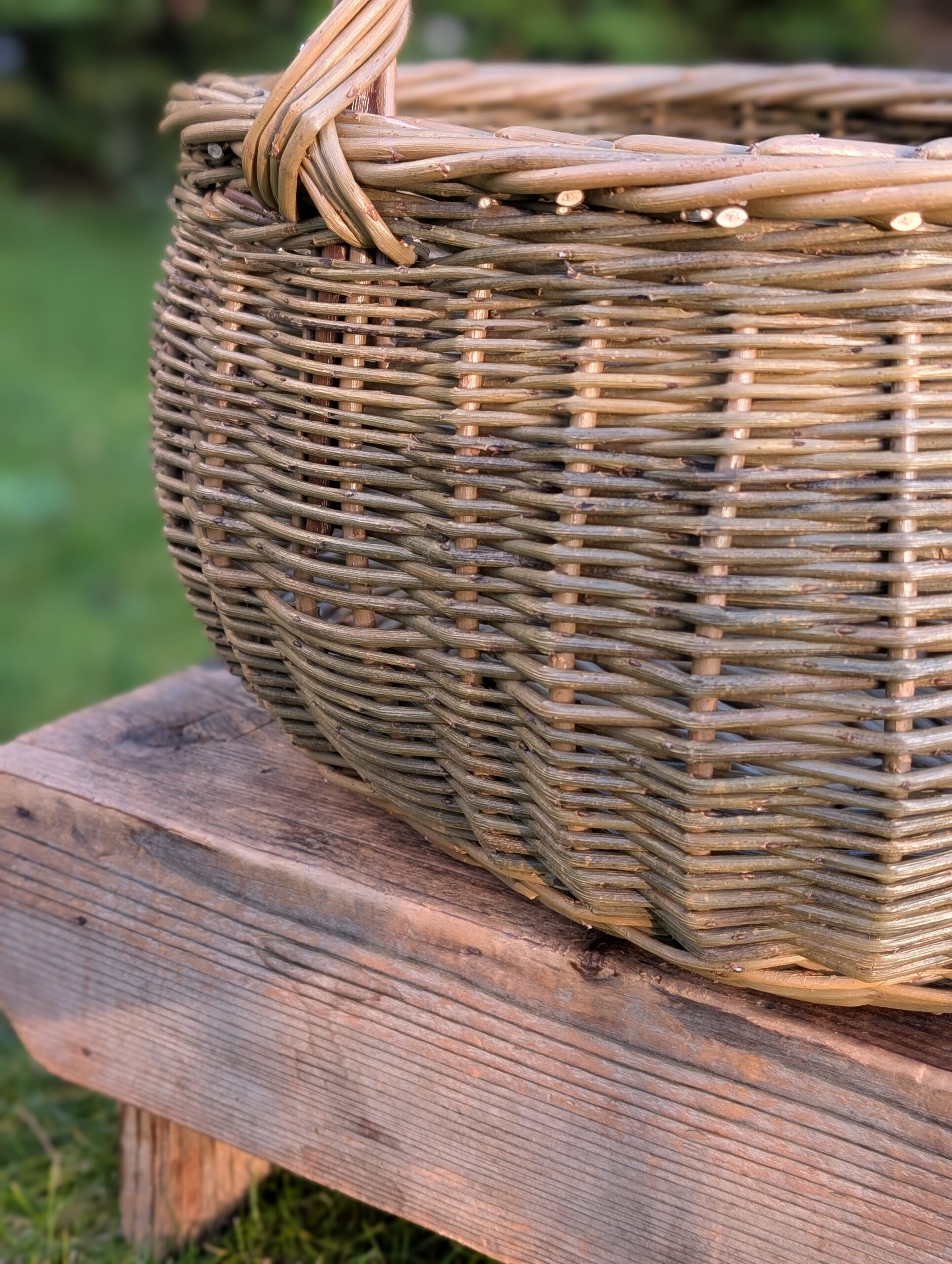 This shopping basket has delicious feminine curves to it – the Gaelic ‘màsach’ literally translating to ‘large-bottomed woman’, which I think describes it perfectly. The bellied shape is also practical, in that it adds more volume for you to squeeze more goodies into. This is my favourite style to nip to the shops with for a quick top-up shop. Three different tones of green willow are used in this one for subtle and natural feeling colour contrasts.