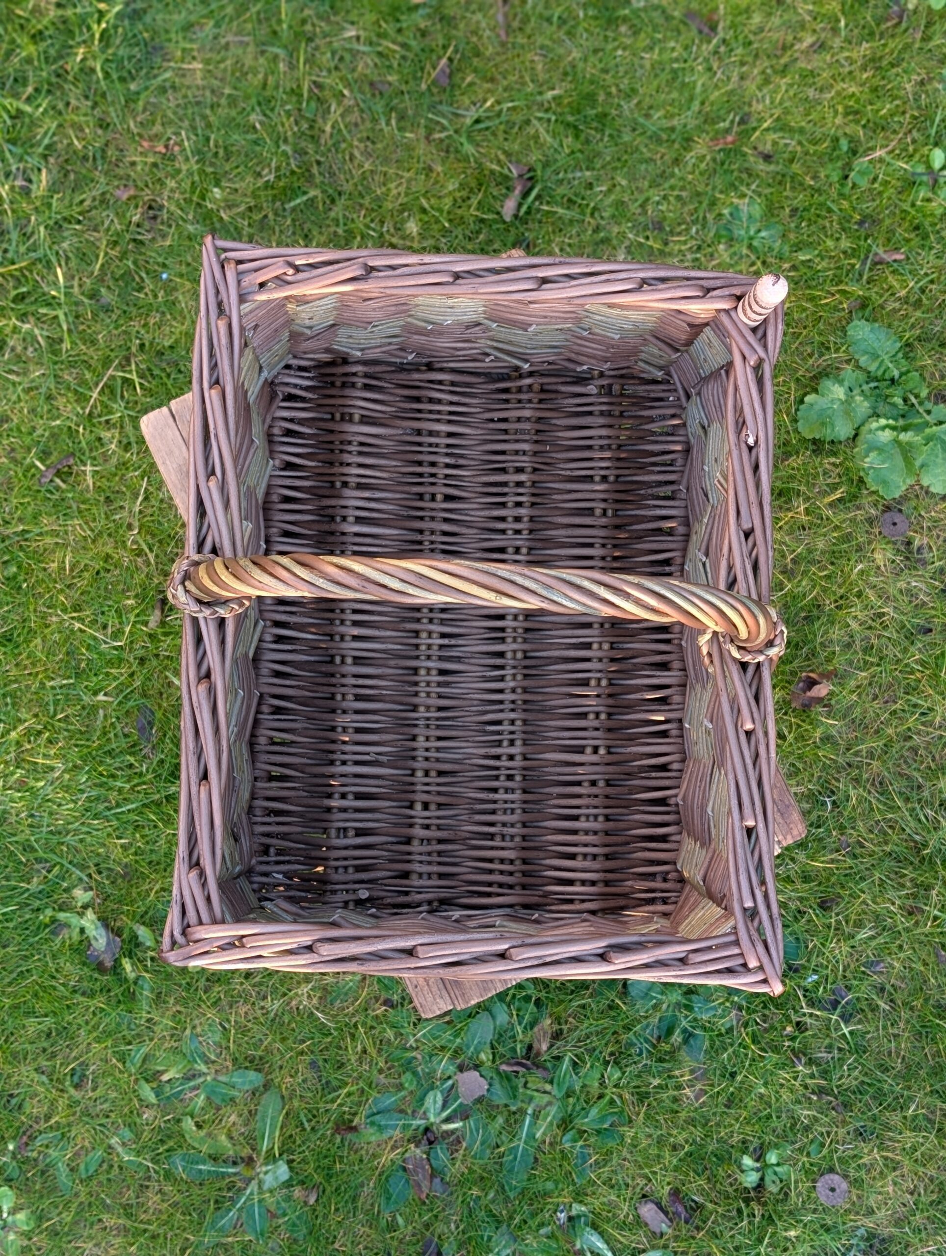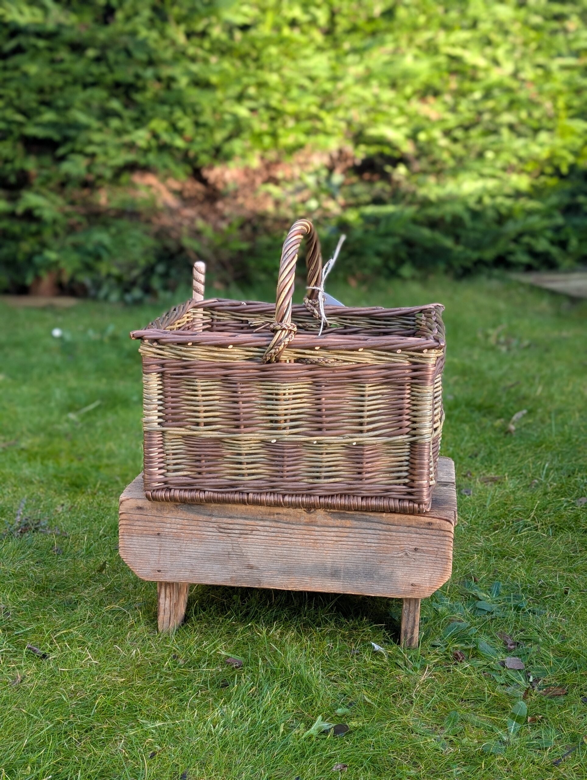 This square foraging basket is made with the stripped, smooth and chocolatey buff noir willow and green Dicky Meadows, giving a lovely mint-choc-chip contrast. It features continental techniques, a striped handle with a plaited detail and a pyrographed peg, designed for hanging something extra onto – doggy bags on a walk, tools for harvesting, or whatever other use you can think of.